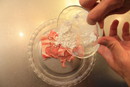 ④ 豚ロース肉に片栗粉をまんべんなく付けて、たっぷりの湯で茹でてザルにあげます。