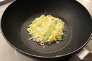 ① フライパンに【A】ごま油を熱し、切り干し大根・カニ風味かまぼこ・ 長ネギを入れて炒め、全体に油がまわったら、卵液を流しいれて大きく混ぜながら丸くまとめ、裏返して両面焼きます。